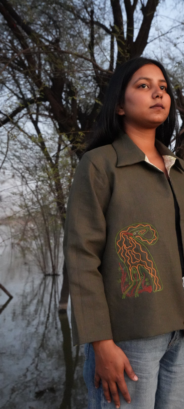 Designed with a structured collar, relaxed sleeves, and a comfortable fit, this jacket transitions seamlessly from day to evening, casual to elevated — while celebrating the essence of handmade craft.